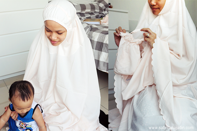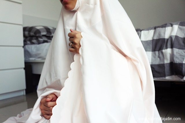 I am not a fan of those thick or satin like telekung. Usually, they are heavy and due to our humid weather, it may not feel comfortable. Well, I can;t expect every prayers room have an air condition right. My favorite type of telekungmaterial is cotton. This Telekung Sofia is made from Chinese Cotton. It is airy, cooling also very comfortable and is breathable. Also, does not shows your body figure much when you move.