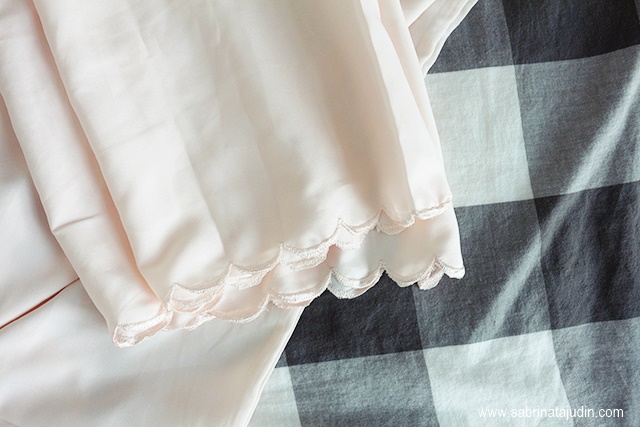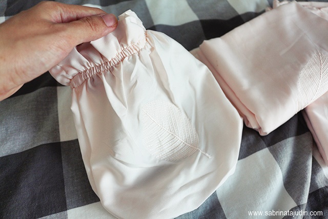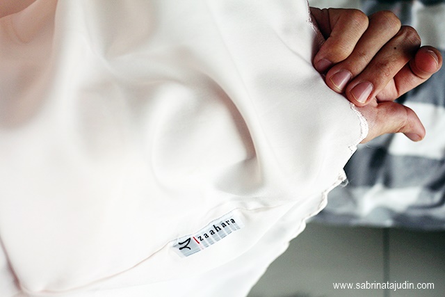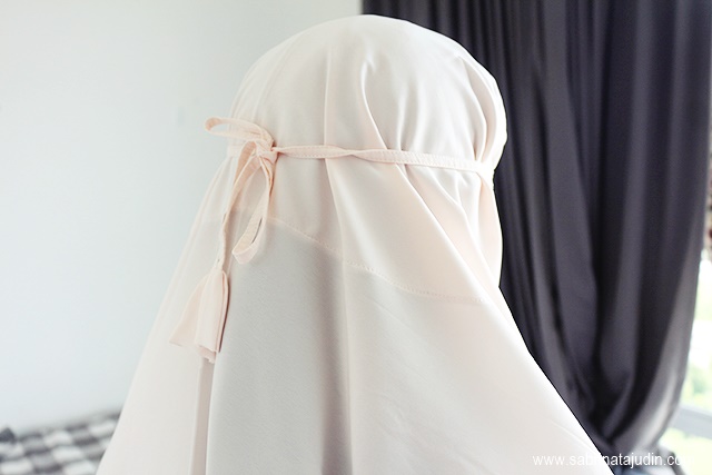 The Telekung Sofia comes with a tie string instead of a stretchable elastic band for comfort. I have to agree on this as I prefer the length or tightness of the string to match my own head size. Usually, a stretchable elastic band will leave my head with a mark. Which sometimes can be an annoying thing haha.